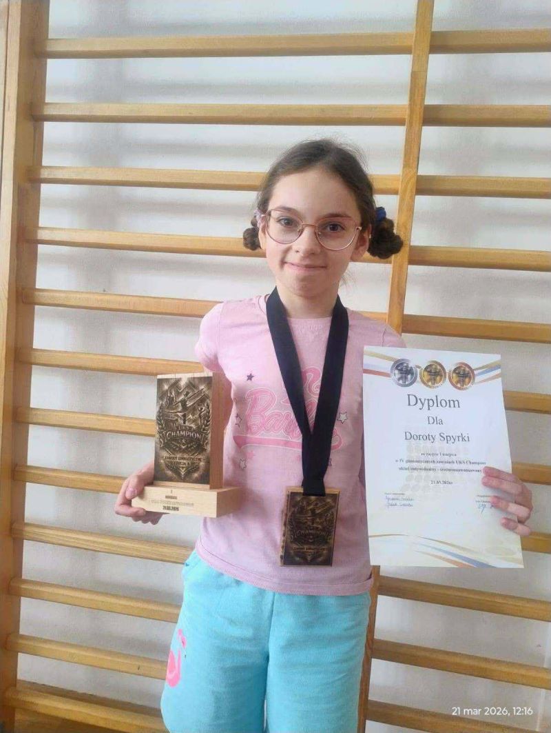 Miło nam poinformować, że Dorota Spyrka, uczennica klasy IV, zajęła I miejsce w IV Gimnastycznych Zawodach UKS Champion w kategorii układ indywidualny – poziom średniozaawansowany. To osiągnięcie jest dowodem Jej dużych zdolności oraz ciężkiej pracy wkładanej w każdy trening.