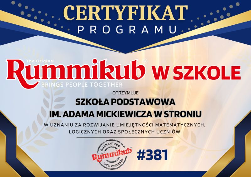 W bieżącym roku Nasza Szkoła realizuje program „Rummikub w szkole”, którego celem jest popularyzacja matematyki i logicznego myślenia w innowacyjny sposób z wykorzystaniem strategicznej gry Rummikub. Gra cieszy się dużą popularnością nie tylko w Polsce, ale i na świecie. Uczy szybkiego dodawania, tworzenia sekwencji, spostrzegawczości i koncentracji uwagi. Ponadto jest świetnym sposobem na naukę przez zabawę.