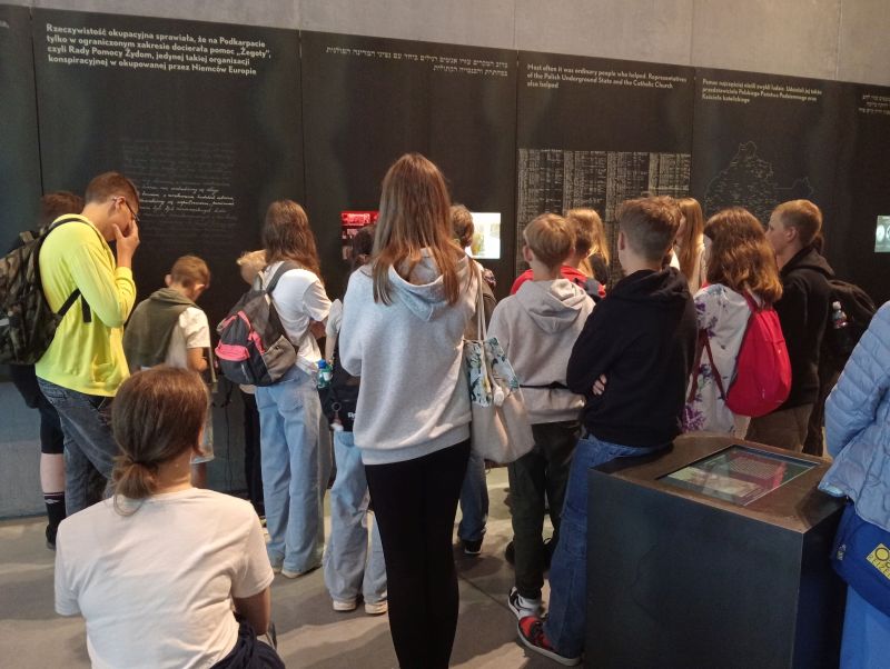 Kolejnym punktem naszej podróży była Markowa. Udaliśmy się na cmentarz oraz do Kościoła p.w. Św. Doroty z Markowej, gdzie mogliśmy się pomodlić przy relikwiach Błogosławionej Rodziny Ulmów. Następnie udaliśmy się do Muzeum Polaków Ratujących Żydów podczas II wojny światowej im. Rodziny Ulmów z Markowej. Pani przewodnik z muzeum w bardzo ciekawy i emocjonalny sposób opowiedziała Nam historię niezwykłej rodziny, która w czasie II wojny światowej ukrywała w swoim domu ośmioro Żydów. Świadomi konsekwencji takiej decyzji, bez wahania nieśli pomoc. Za swoją postawę zapłacili najwyższą cenę. 24 marca 1944 r. Wiktoria i Józef Ulmowie wraz z sześciorgiem Swoich małych dzieci i jednym nienarodzonym ponieśli śmierć z rąk niemieckich okupantów. 10 września 2023 r. odbyła się ich beatyfikacja. Uczniowie w dużym skupieniu słuchali przewodnika, który wyjaśnił symbolikę i koncepcję muzeum. Uczniowie z Naszej Szkoły dowiedzieli się również, jak Polacy pomagali w czasie II wojny światowej ukrywać Żydów.