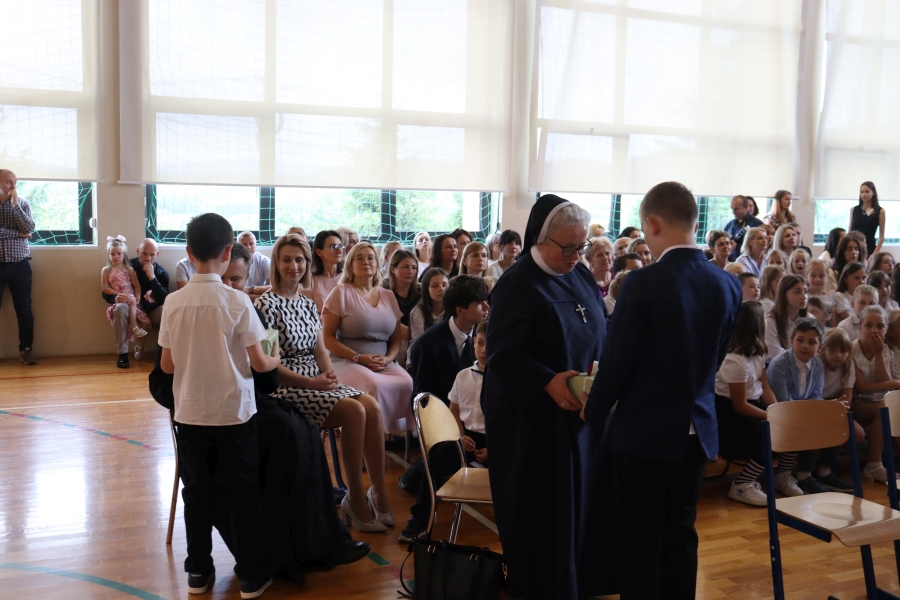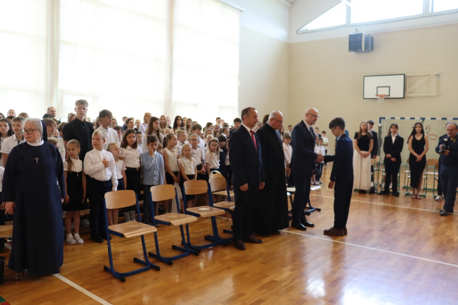 27 czerwca zakończyliśmy rok szkolny 2024/2025. Uroczystość rozpoczęliśmy Mszą świętą w kaplicy, a następnie w budynku szkoły odbyła się akademia, w czasie której miało miejsce ślubowanie nowego Samorządu Uczniowskiego oraz przekazanie opieki nad sztandarem Szkoły. Następnie głos zabrał Pan Dyrektor Krzysztof Pyrdoł, który podziękował zaproszonym gościom: Proboszczowi Parafii Przyszowa Księdzu Janowi Gajda, siostrze Elżbiecie Sienkiel, księdzu Marcinowi Mastalskiemu oraz Panu Sołtysowi Stanisławowi Jedleckiemu za pomoc w rozwoju Naszej społeczności. Wszystkim Uczniom podziękował za rok wytężonej pracy i życzył Absolwentom sukcesów w nowych szkołach.