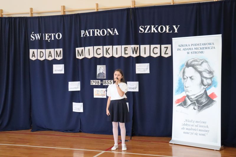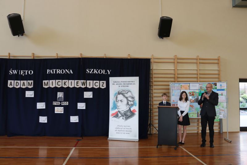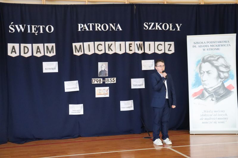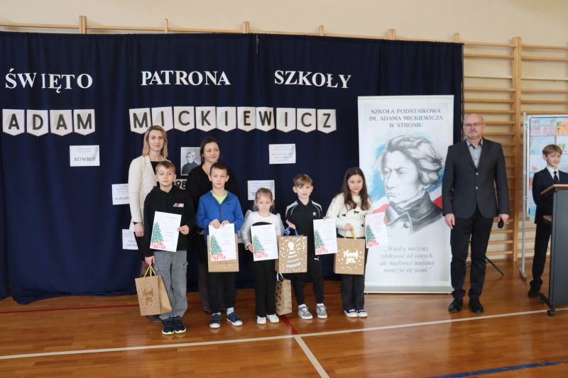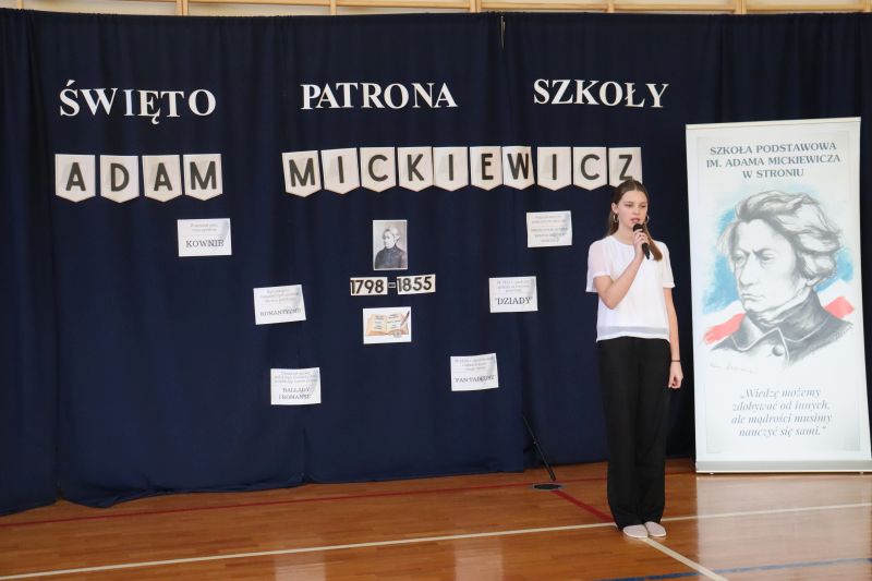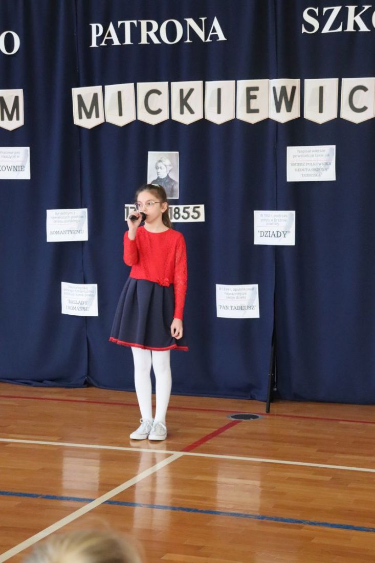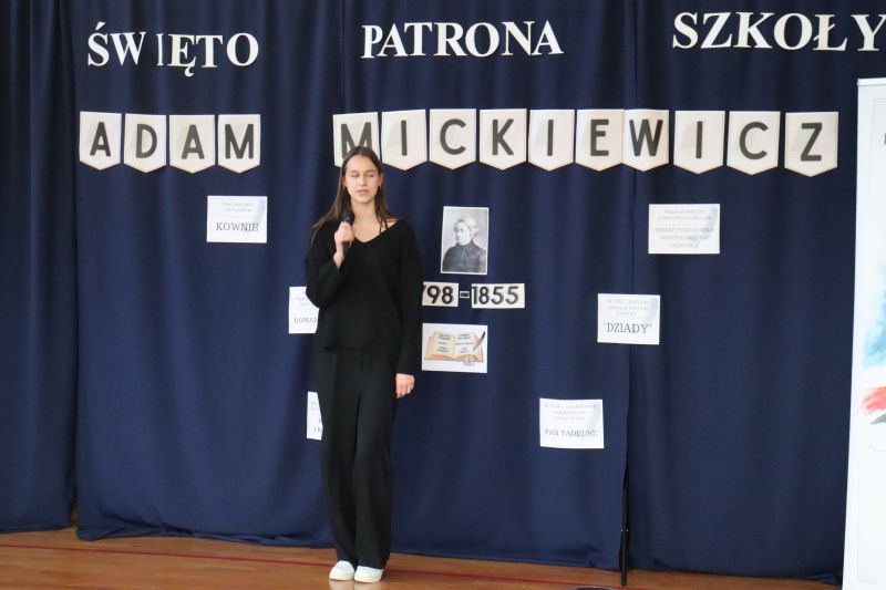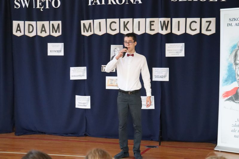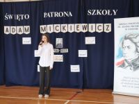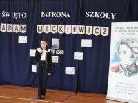 16 grudnia, jak co roku obchodziliśmy kolejną rocznicę urodzin Patrona Szkoły- Adama Mickiewicza. Z tej okazji odbyła się akademia, w czasie której uczniowie przypomnieli najważniejsze fakty z życia i twórczości Naszego Wieszcza Narodowego. Tegoroczna akademia była połączona z Konkursem Recytatorskim Poezji Mickiewicza, w czasie którego uczniowie z klas IV- VIII zaprezentowali wybrane utwory poety. Następnie komisja konkursowa wybrała trzy najlepsze recytacje, a oto wyniki: