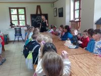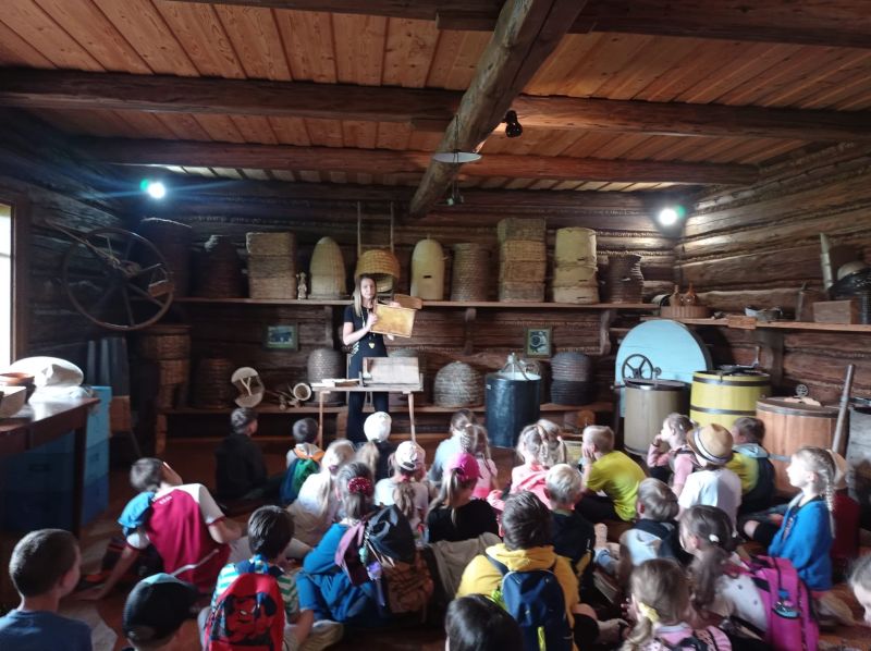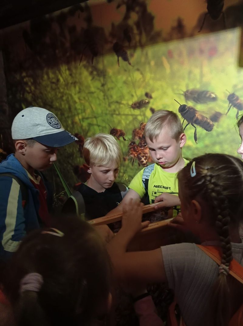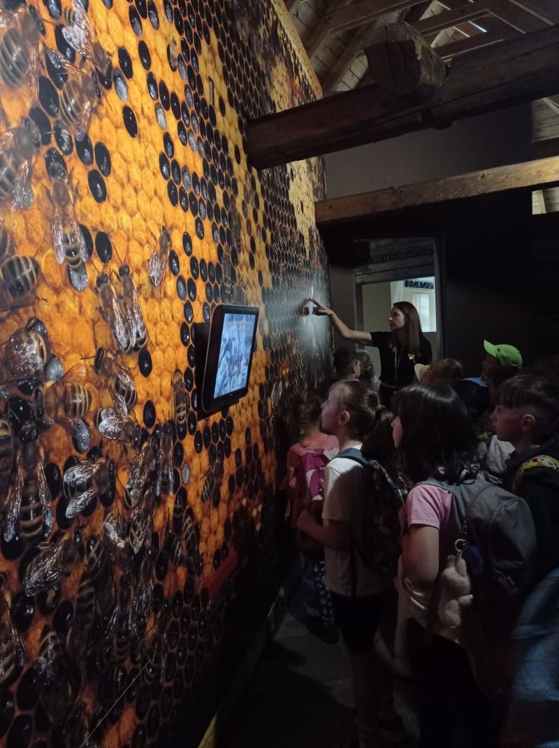 Następnie grupa udała się w plener aby obejrzeć kolekcję barci i uli, przekonać się jak na przestrzeni stuleci zmieniał się ich wygląd i funkcjonalność. Uczniowie zwiedzili ekspozycję muzealną, a także zapoznali się z różnego rodzaju sprzętami i przyrządami pasiecznymi, a przede wszystkim z trudną, ale jakże potrzebną pracą pszczelarza.