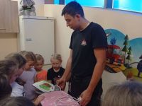 Kolejną atrakcją wycieczki była wizyta w Państwowej Straży Pożarnej w Nowym Sączu. Dzieci dowiedziały się jak funkcjonuje jednostka strażacka, jak wygląda trudna i niebezpieczna praca strażaków, która oprócz prowadzenia akcji gaśniczych polega również na udzielaniu pomocy ludziom podczas powodzi, wypadków komunikacyjnych, klęsk żywiołowych, a także usuwania ich skutków.